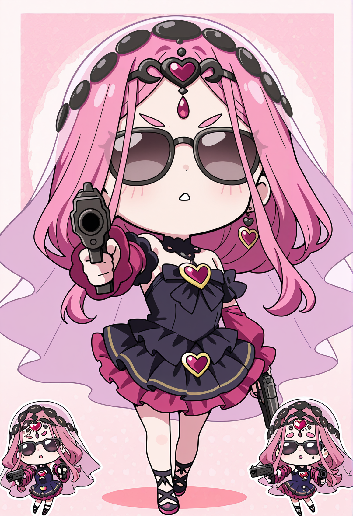 Alternate costume: pink hair, long hair, heterochromia, purple eyes, blue eyes, official alternate costume, circlet, veil, short dress, detached sleeves, heart brooch