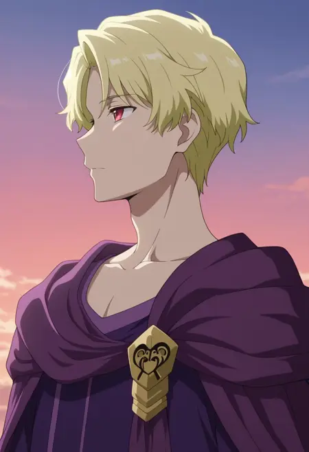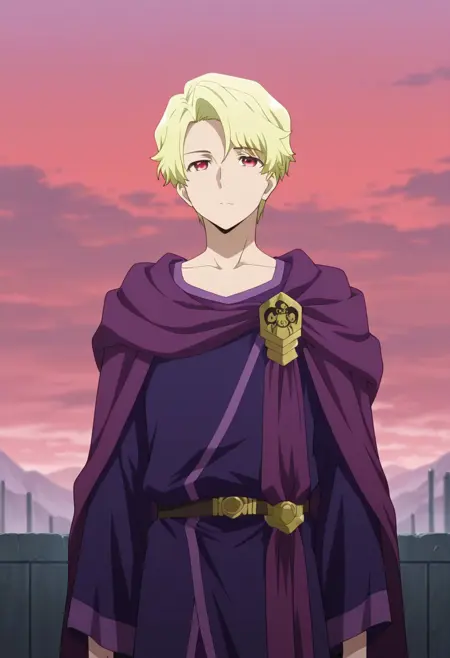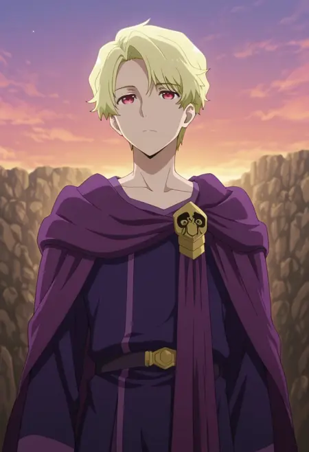 1소년, 남성 중심, 단독, 빨간 눈, 금발, 어깨뼈, 보라색 망토, 보라색 로브,