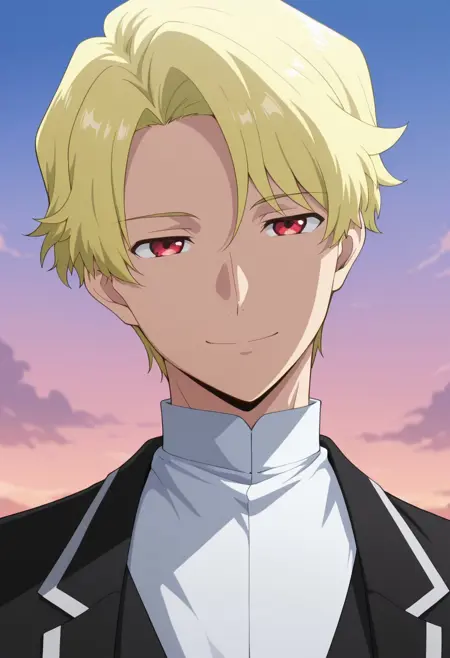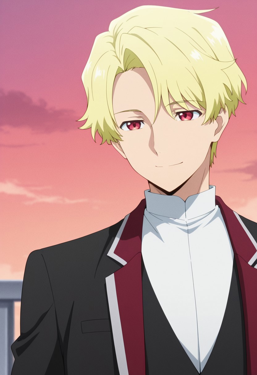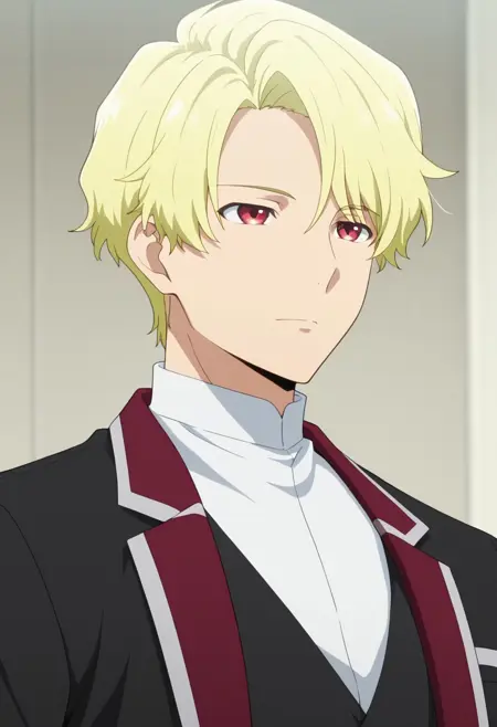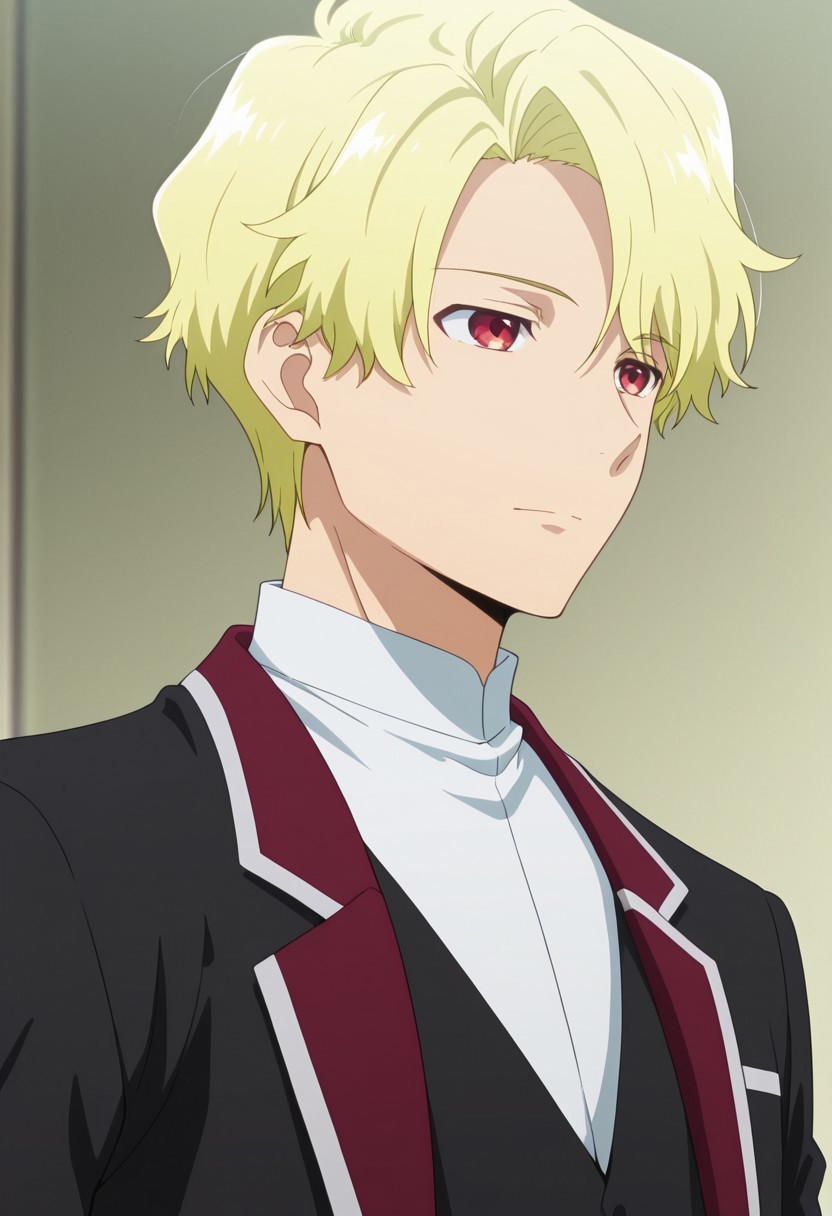 1소년, 남성 중심, 단독, 빨간 눈, 금발, 흰 셔츠, 만다린 칼라, 검정 재킷, 벌어진 재킷, 검정 조끼, 회색 바지, 신발,