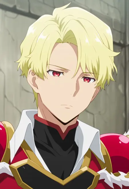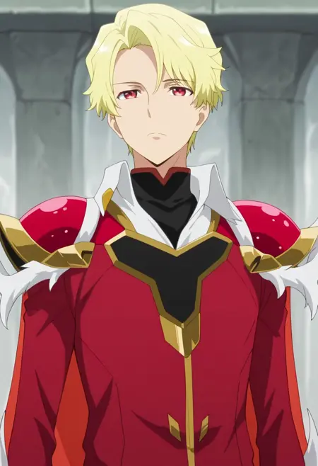 1소년, 남성 중심, 단독, 빨간 눈, 금발, 검정 셔츠, 흰 셔츠, 칼라 셔츠, 어깨 갑옷, 빨간 재킷, 회색 장갑, 흰 바지, 부츠,
