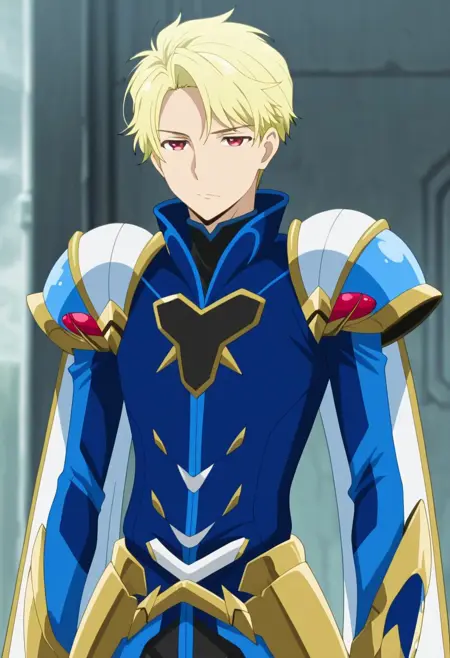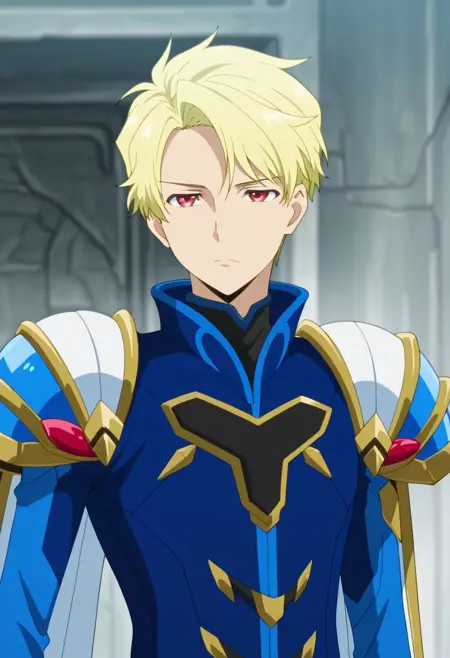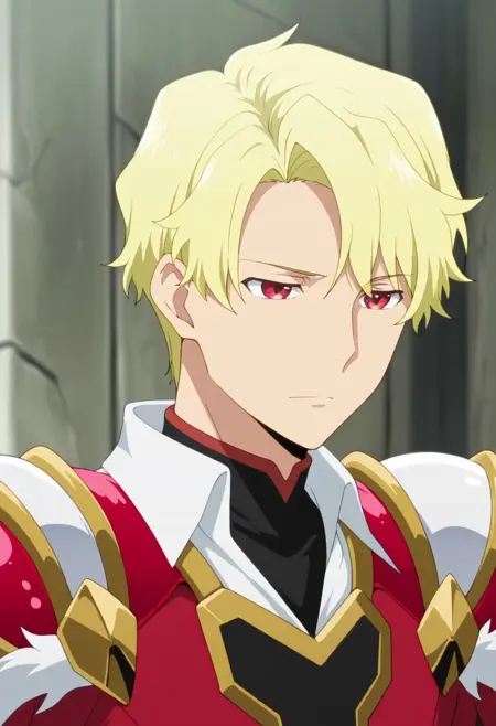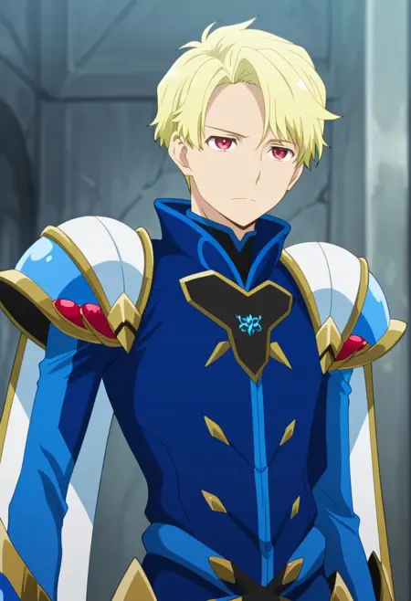 1소년, 남성 중심, 단독, 빨간 눈, 금발, 파란 갑옷, 어깨 갑옷, 흰 망토, 회색 장갑, 검정 바지, 부츠, 파란 신발,