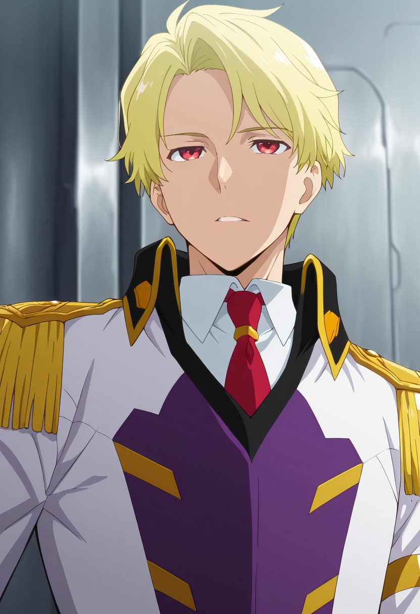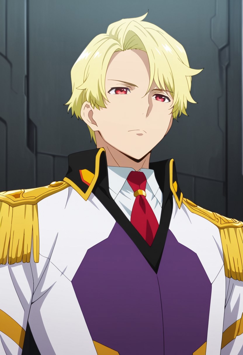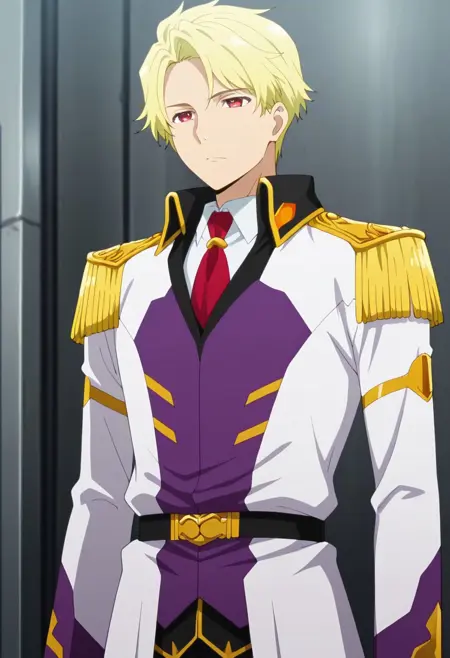 1소년, 남성 중심, 단독, 빨간 눈, 금발, 흰 셔츠, 칼라 셔츠, 빨간 넥타이, 어깨장식, 흰 코트, 흰 장갑, 벨트, 흰 바지, 바지를 신발 안에 넣음, 부츠, 검정 신발,