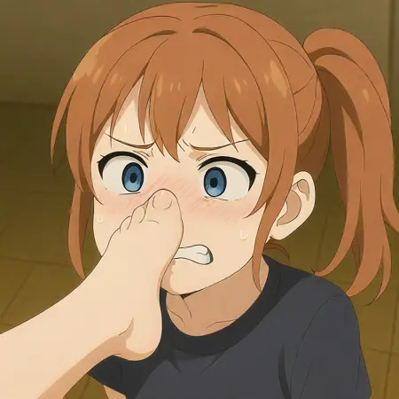 Solo, forced foot worship, foot over nose, foot against nose, sniffing foot, viewers foot on face, embarrassed expression, blushing, reluctant, squished nose bridge, upturned nose, foot focus, toes over nose, kneeling, foot worship,