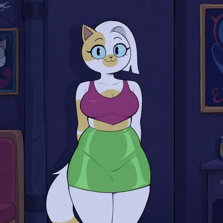 C4ke(character), female, cat, anthro, purple top, green tube skirt,