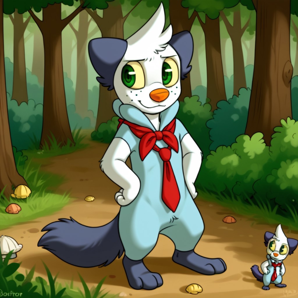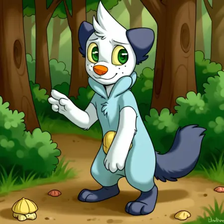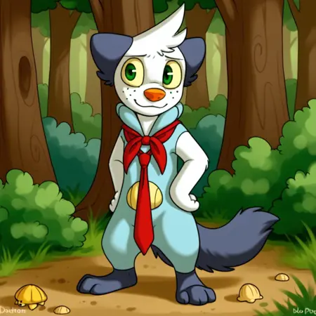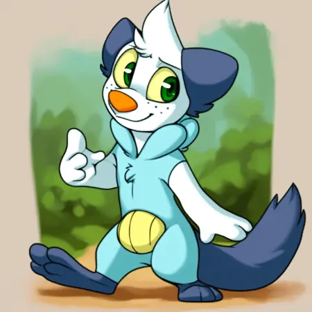 oshawott, pokemon (creature), otter, white and blue fur, green eyes, yellow sclera, freckles, dark ears, orange nose, dark feet, fluffy tail, seashell on stomach,