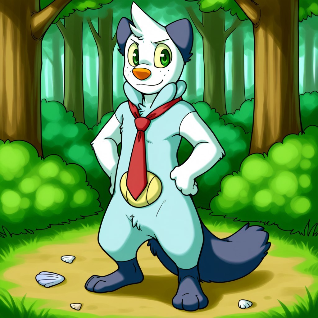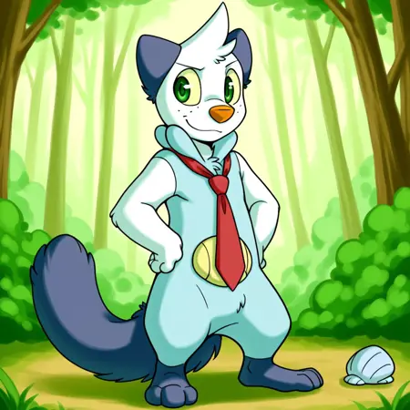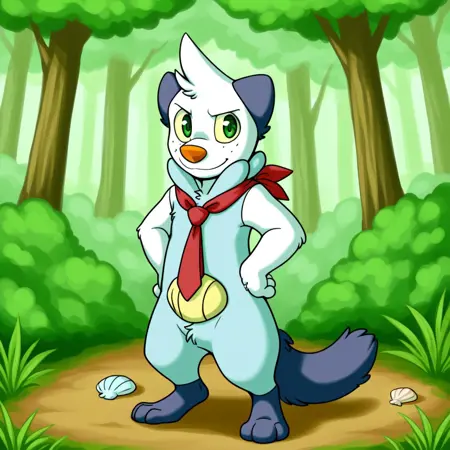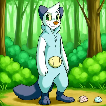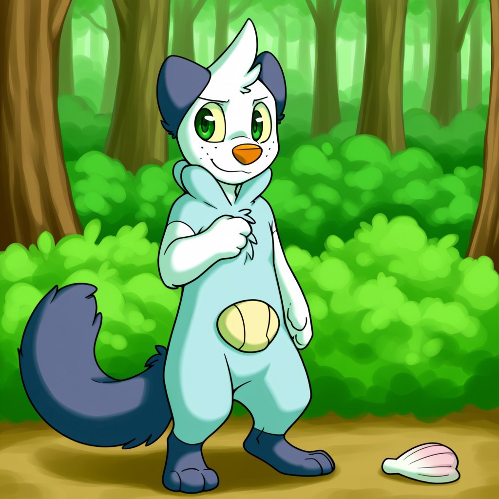 oshawott, pokemon (creature), otter, white and blue fur, green eyes, yellow sclera, freckles, dark ears, orange nose, dark feet, fluffy tail, seashell on stomach,
