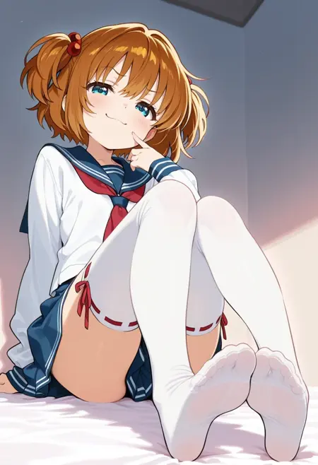 파란색 선원 칼라, 빨간색 넥커치프, 파란색 미니스커트, 흰색 트림, 리본 트림 허벅지 양말,