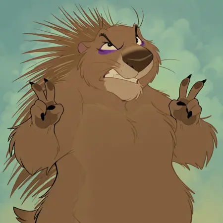furry, porcupine male, mature, brown fur with light brown accents, porcupine quills, black eyes, two teeth, missing teeth, small tail, black claws, purple under eyes,