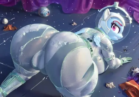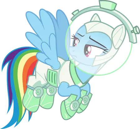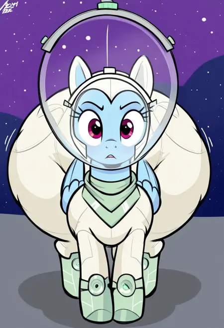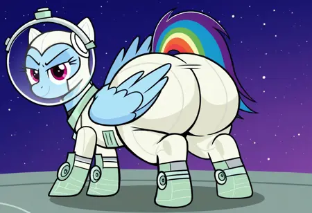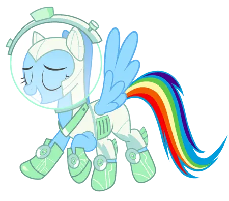 <lora:MLP: FIM - trick or treat - Rainbow Dash:1>, astronaut suit, (space helmet:1.3), (no mane:1.2), (sealed helmet:1.2), space outfit, (white and gray spacesuit with blue details:1.1), reflective visor, detailed suit design, (no hair visible), (no exposed mane),