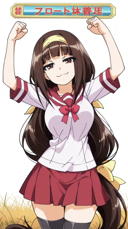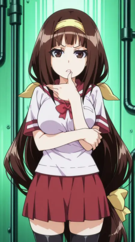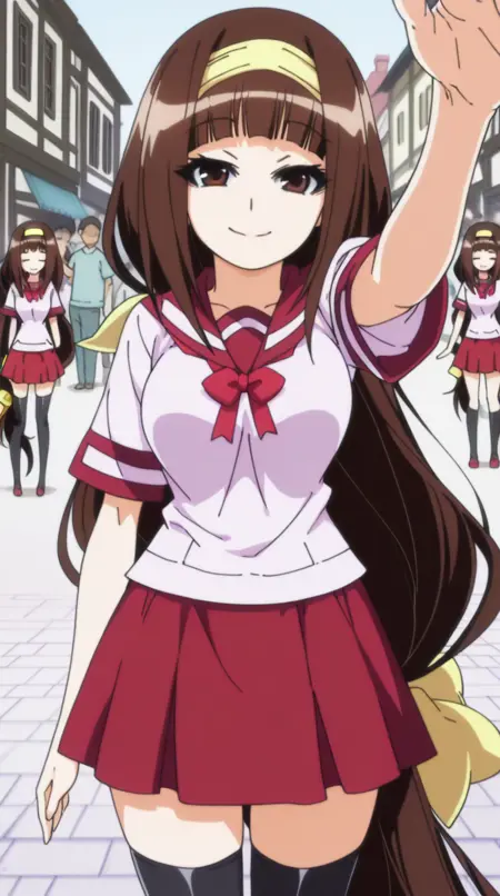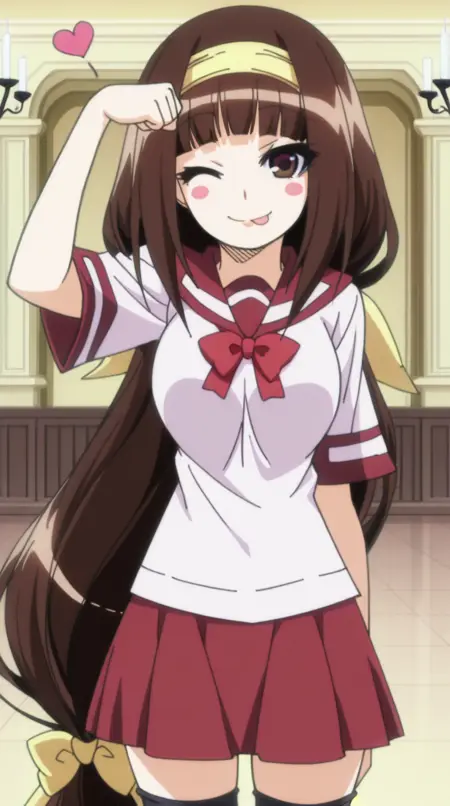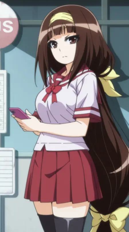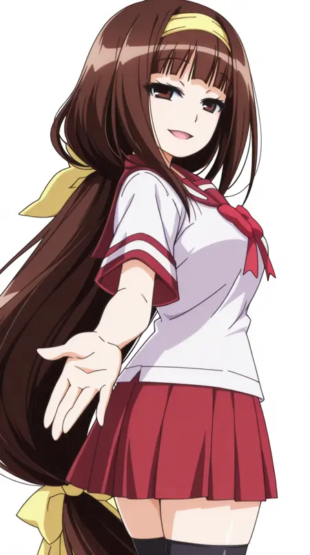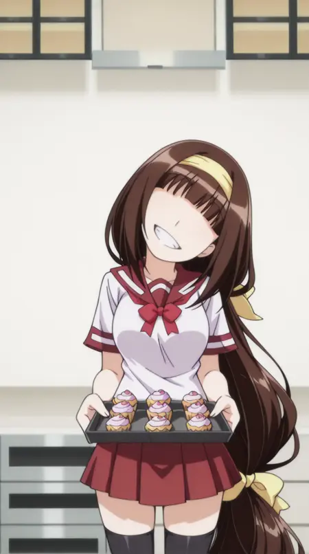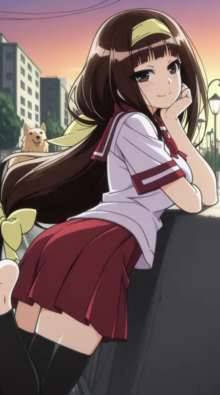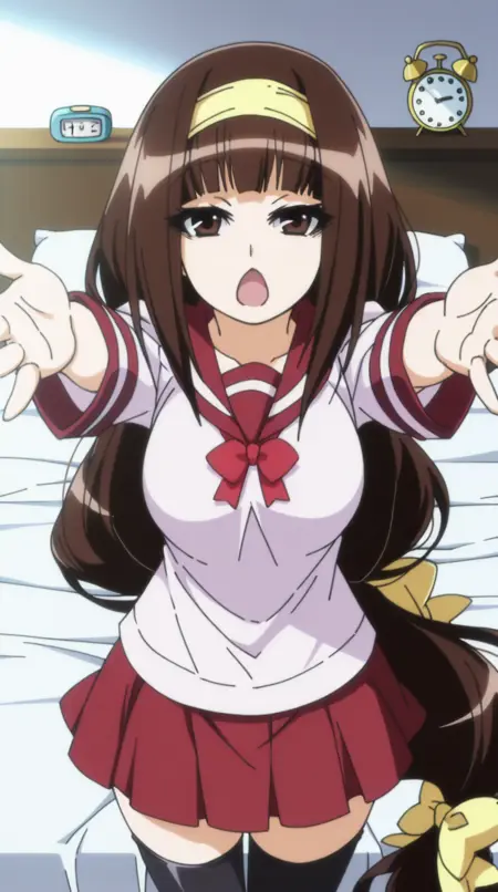 najimi ajimu,长发,棕色头发,蝴蝶结,丝带,棕色眼睛,极长发,低扎长发,发带,发饰蝴蝶结,黄色发带,成熟女性,中等胸部,动漫截图