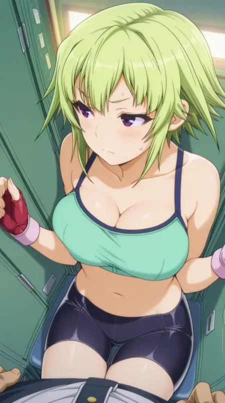 手袋、へそ、胸元、腹筋、フィンガーレスグローブ、タンクトップ、自転車用ショートパンツ、スポーツブラ