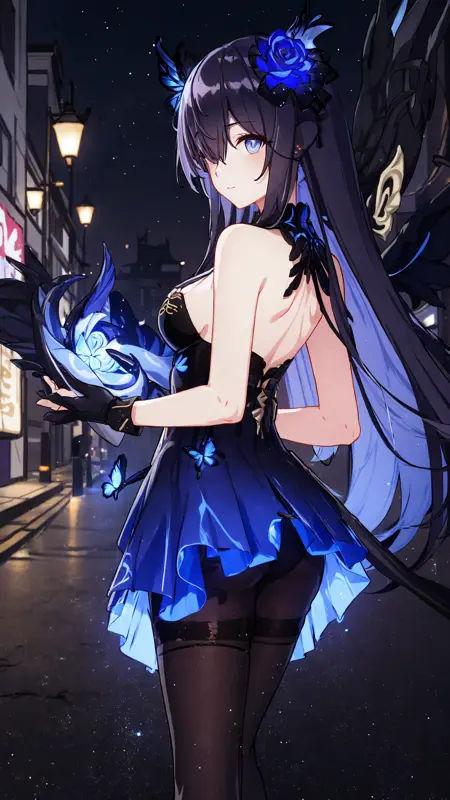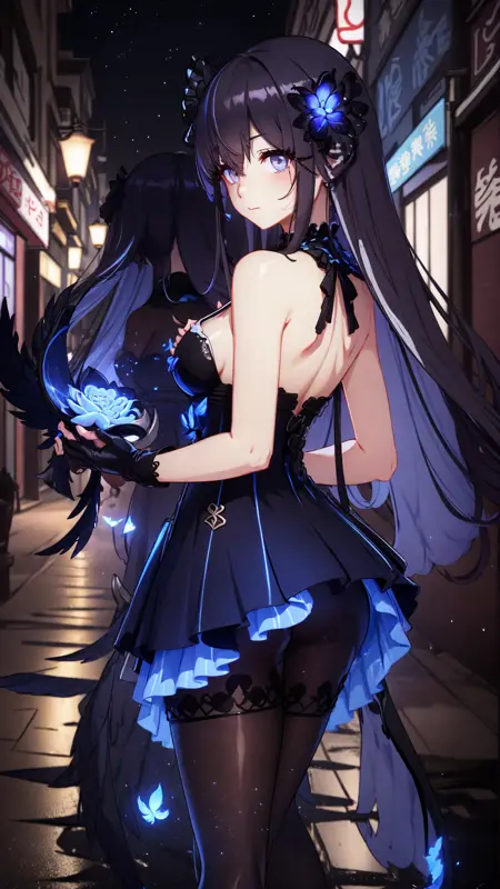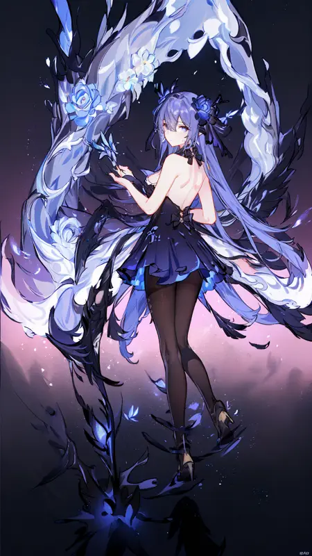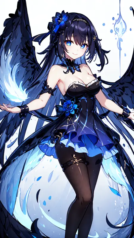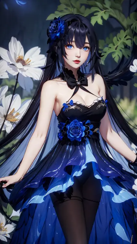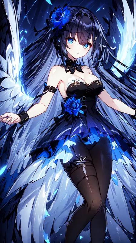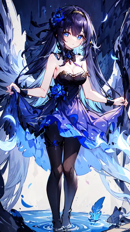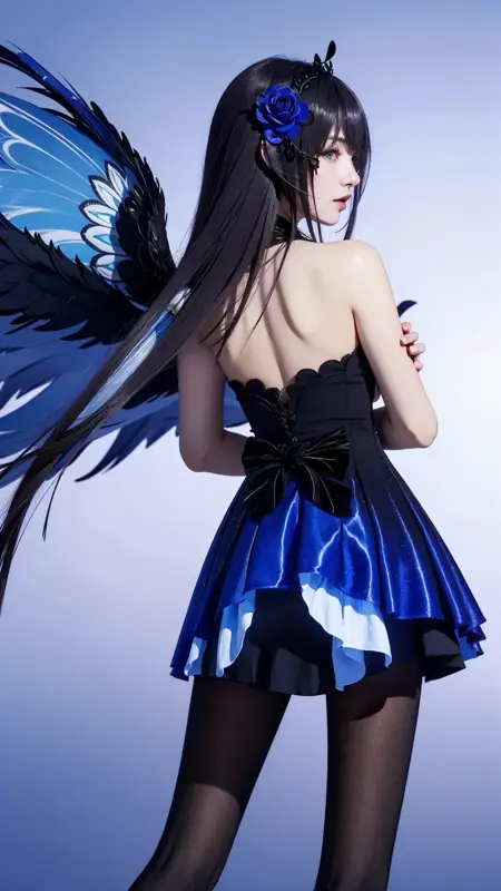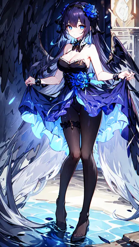 タグに以下を使用可:フリル、ドレス、髪飾り、肩出し、中くらいの胸、前髪、青い髪、非常に長い髪、内側の彩色髪、多色髪、ツートーン髪、黒いパンティストッキング、青いドレス、手首のカフス、青い目、Seele Vollerei、太ももストラップ、ストラップレスドレス、青い花、髪の花、胸元、青い薔薇、ノースリーブドレス、ヘアバンド、低めの黒い翼、羽、これにより衣装がより正確に再現される。