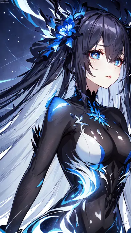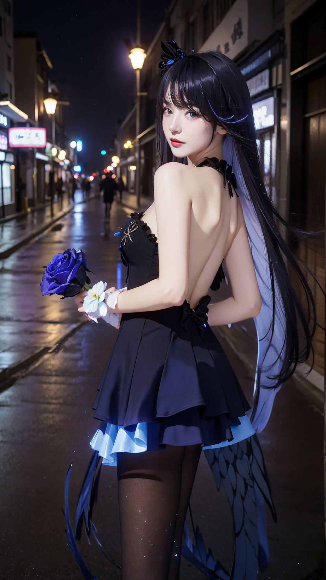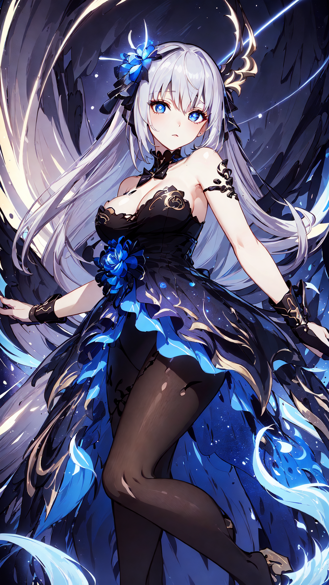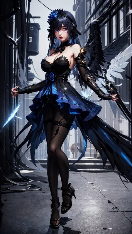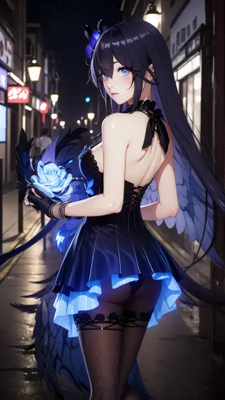 タグに以下を使用可:フリル、ドレス、髪飾り、肩出し、中くらいの胸、前髪、青い髪、非常に長い髪、内側の彩色髪、多色髪、ツートーン髪、黒いパンティストッキング、青いドレス、手首のカフス、青い目、Seele Vollerei、太ももストラップ、ストラップレスドレス、青い花、髪の花、胸元、青い薔薇、ノースリーブドレス、ヘアバンド、低めの黒い翼、羽、これにより衣装がより正確に再現される。