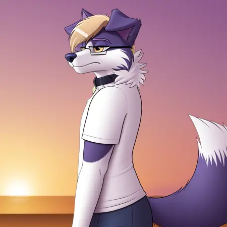 border collie, canid, canine, canis, collie, domestic dog, herding dog, pastoral dog, sheepdog, furry, anthro, dean, blonde hair, yellow eyes, glasses, dark purple nose, black ear ring, ear piercing, collar, tail, fluffy tail, white fur, purple fur, two tone fur, male, 1boy