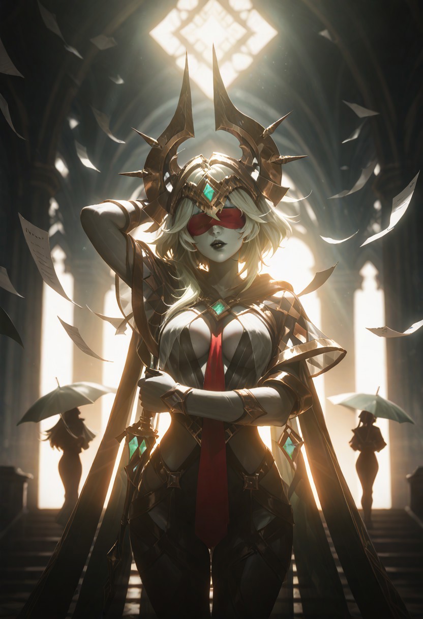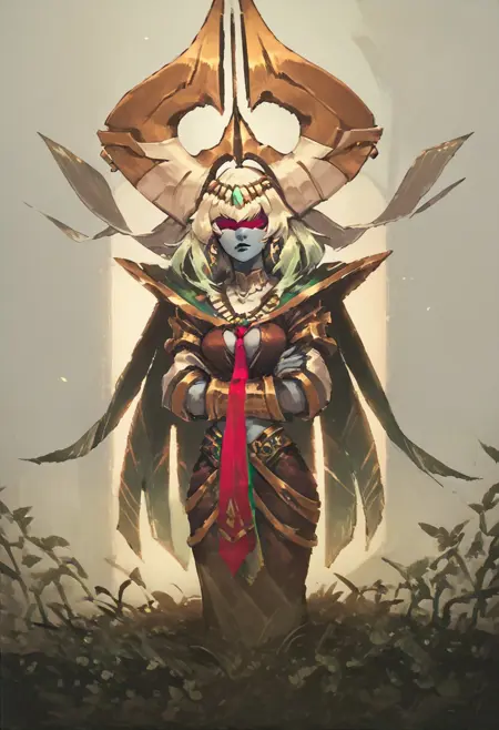 1girl, carmen, crossed arms, black lips, light green hair, red tie, cleavage, breasts, gray skin, colored skin