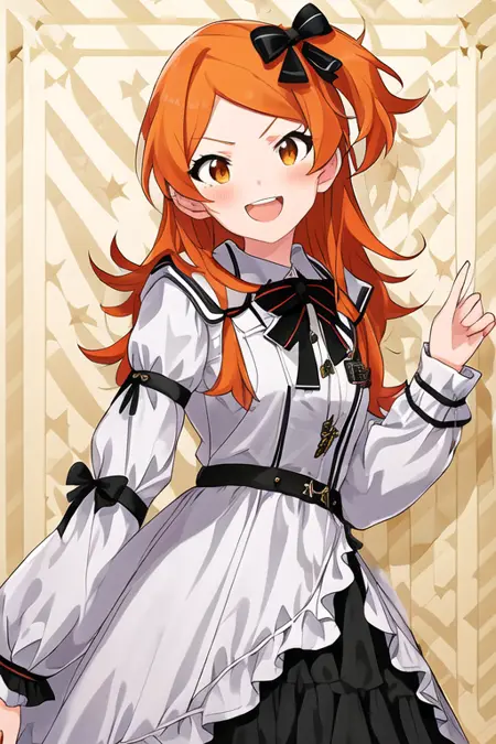 long hair, smile, 1girl, one side up, open mouth, brown hair, solo, looking at viewer, brown eyes, :d, blush, orange hair, hair ornament, orange eyes, dress, shorts, jacket, v-shaped eyebrows, multiple girls, hat