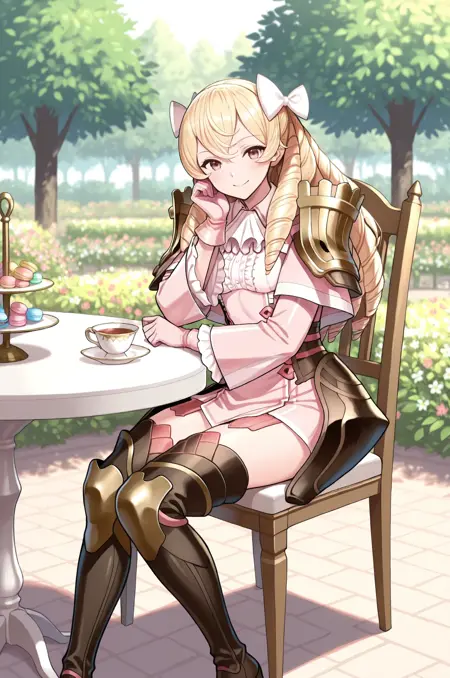 1girl, maribelle \(fire emblem\), long hair, blonde hair, hair ribbons, ascot, pink dress, pink gloves, shoulder armor, armor, thighhighs, boots,