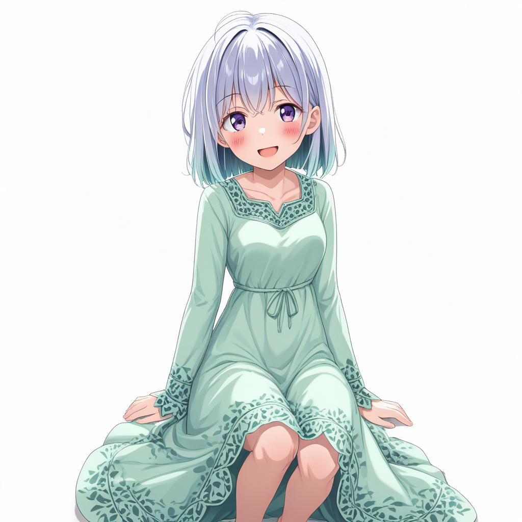 Elf, pointy ears, bob, silver hair with a gradient of green tips, cerulean blue eyes, knee-length long-sleeved dress with leaf pattern