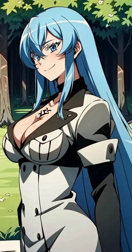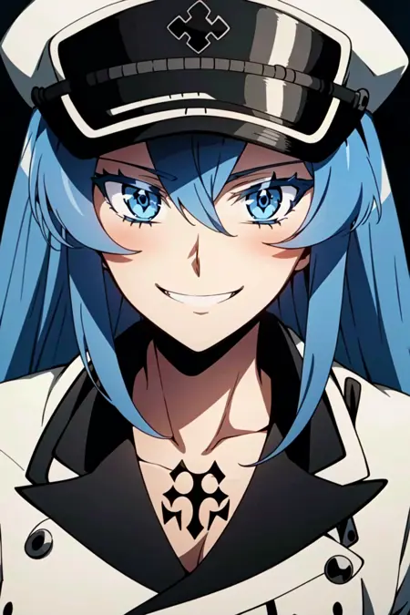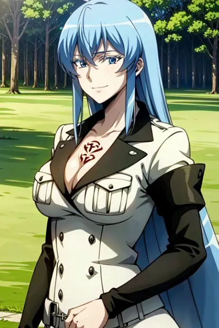 Esdeath, 1girl, solo, breasts, thigh boots, long hair, blue hair, blue eyes, thighhighs, hat, solo, very long hair, cleavage, boots, white footwear, large breasts, military uniform, military, uniform, choker, ice, peaked cap, sky, zettai ryouiki, cloud, white thighhighs