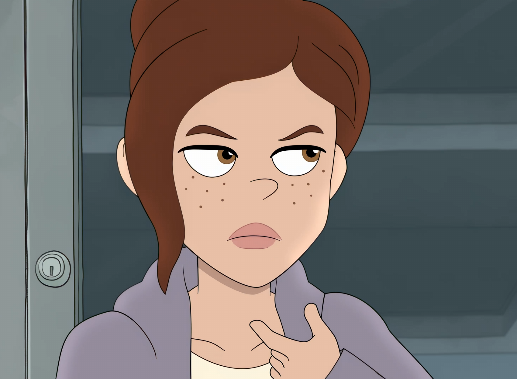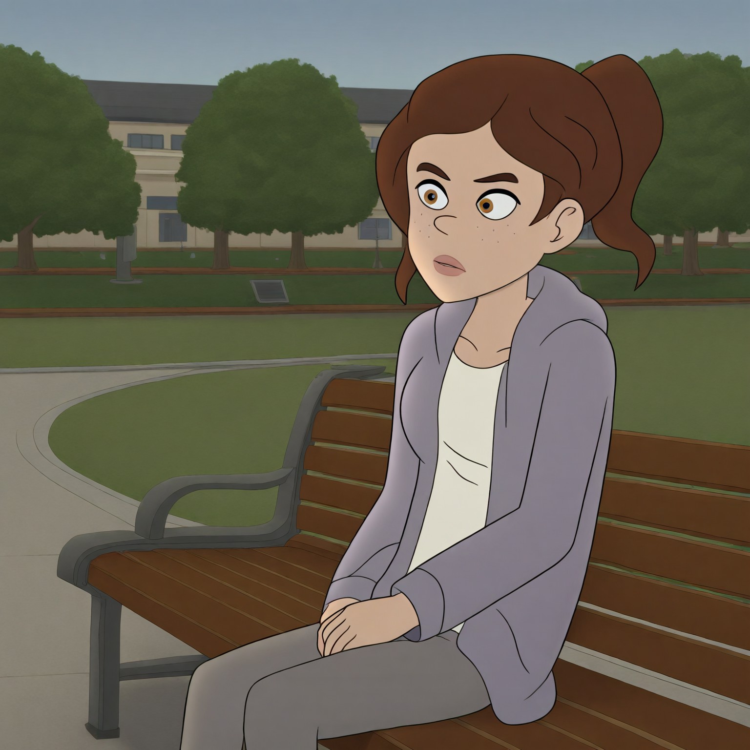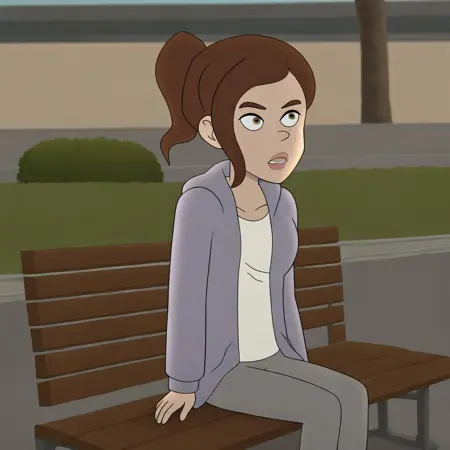 Laura, 1girl, brown hair, brown hair tied in a ponytail, brown eyes, purple jumper, white tank top, grey pants, purple sneakers
