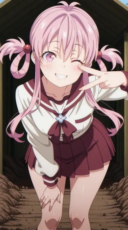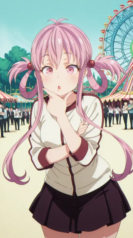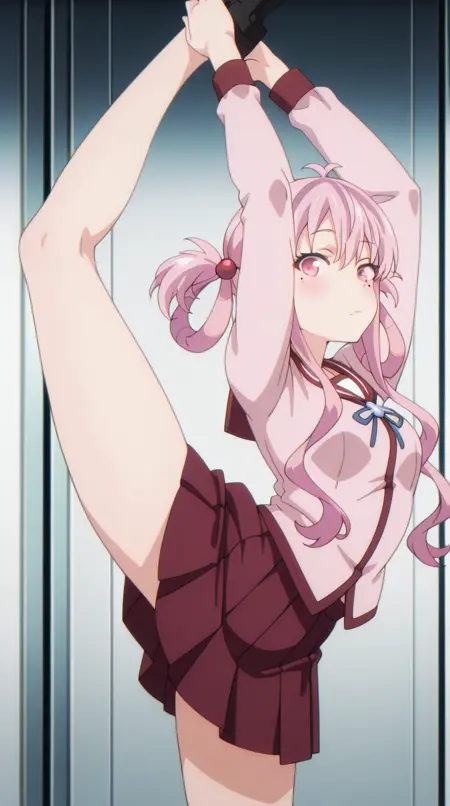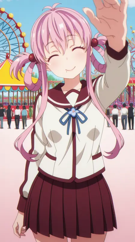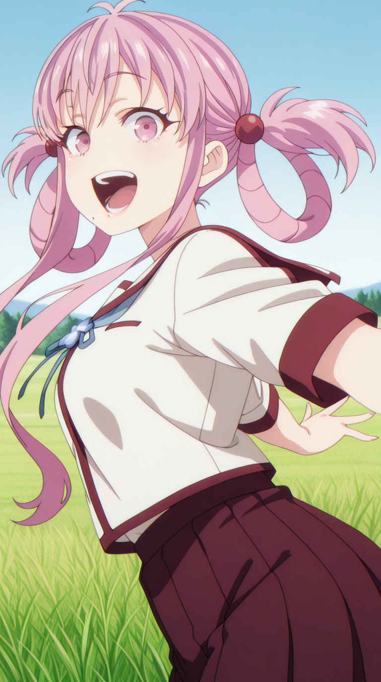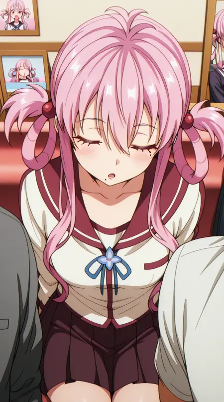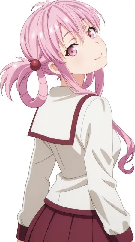 momo sakurabara, long hair, hair ornament, twintails, pink hair, pink eyes, mole, hair bobbles, hair rings, mature female, small breasts, anime screencap
