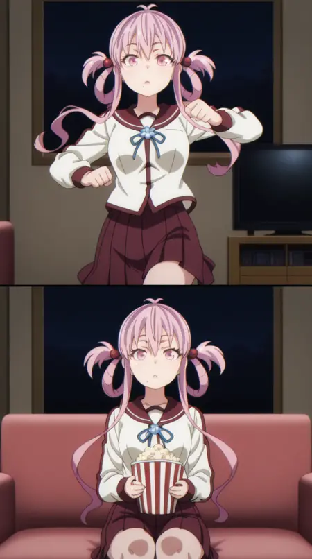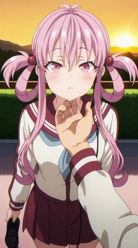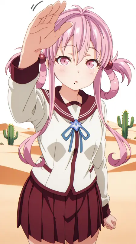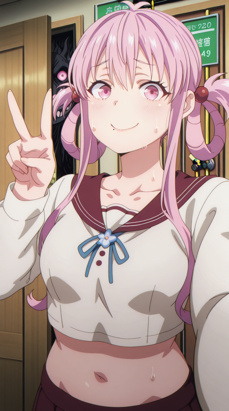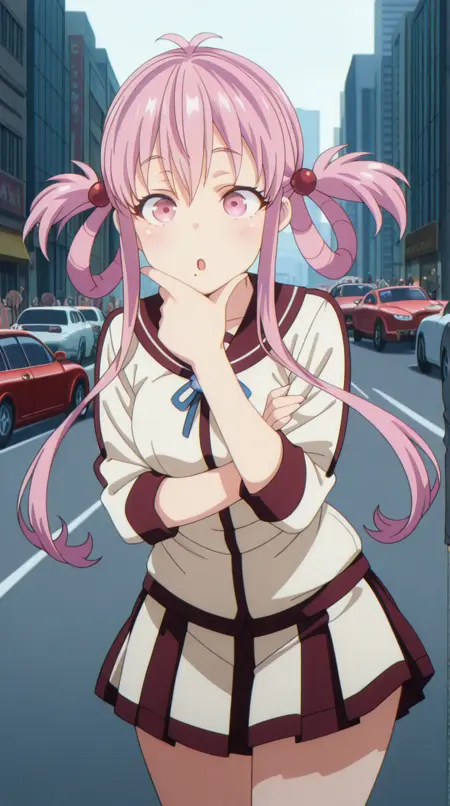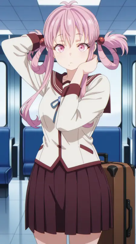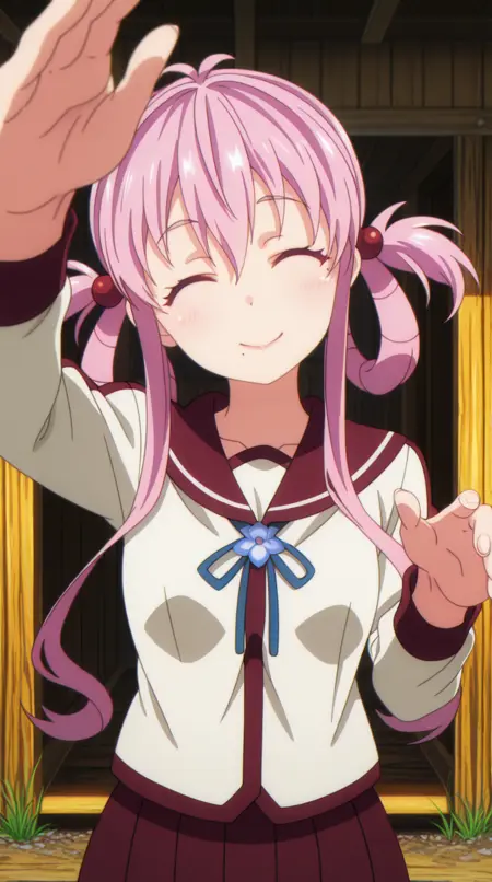 momo sakurabara, long hair, hair ornament, twintails, pink hair, pink eyes, mole, hair bobbles, hair rings, mature female, small breasts, anime screencap