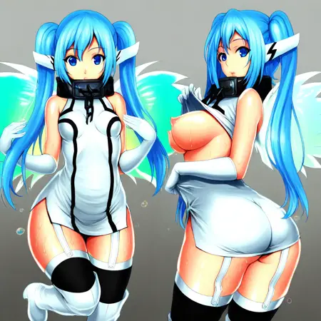(SNO_Nymph, long hair, twintails, blue hair, blue eyes, robot ears, collar, chain, wings, dress, elbow gloves, garter straps, thighhighs, boots),