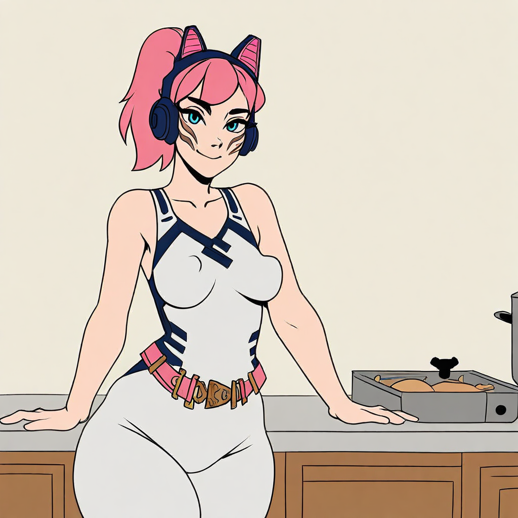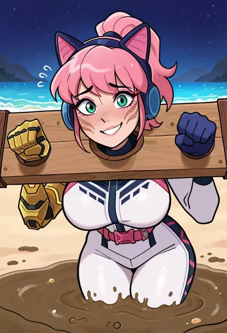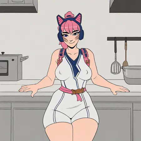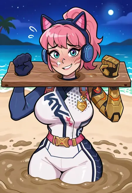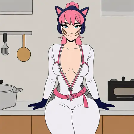 gold robotic left arm, white racing suit with blue markings, midnight blue glove on right hand, pink belt, pink bandolier,