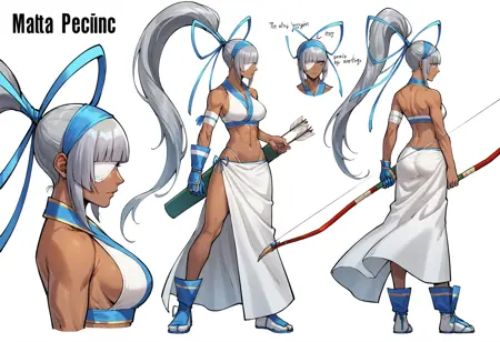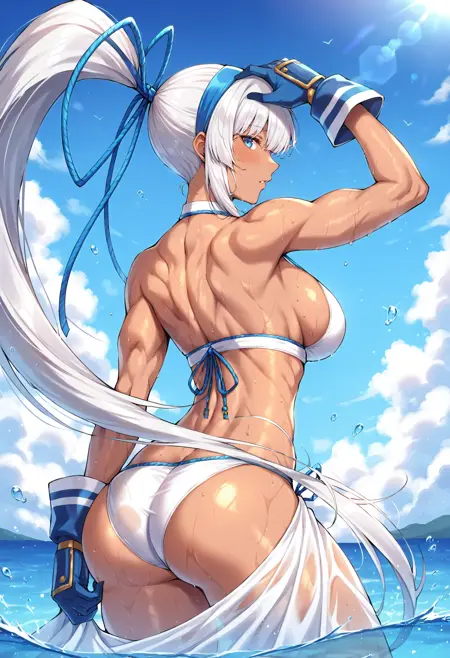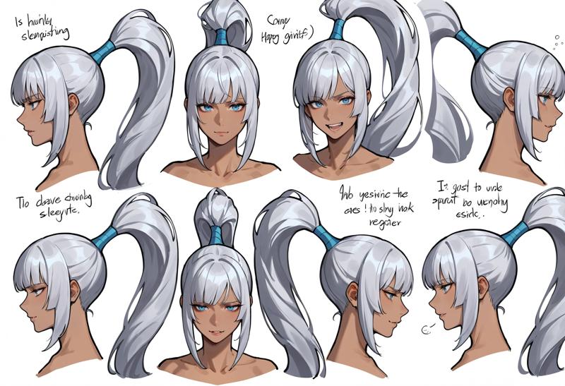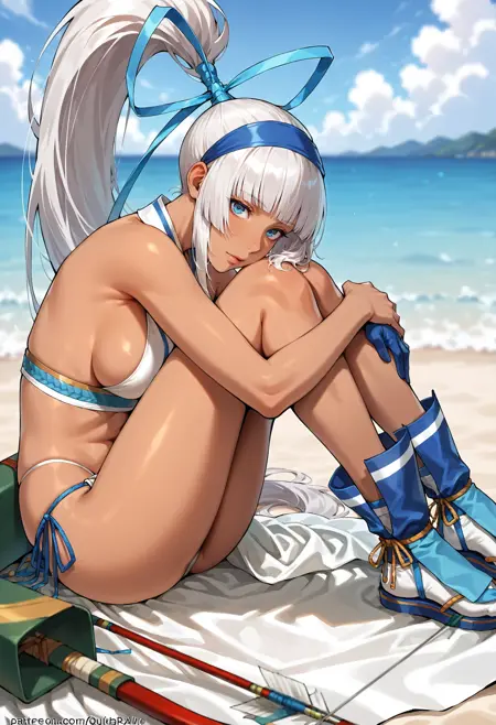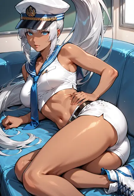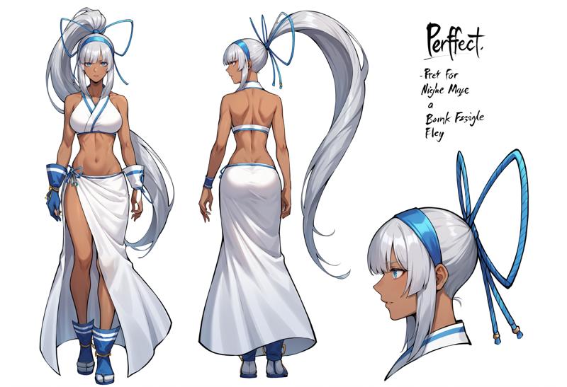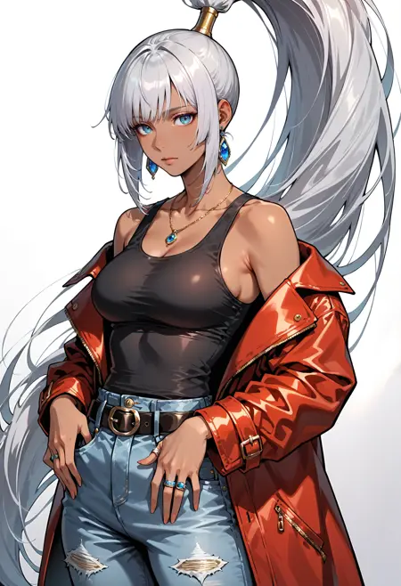 Appearance: 1girl,white hair, gray hair, long hair,blue eyes,very long hair,ponytail,high ponytail,bangs,dark skin,dark-skinned female