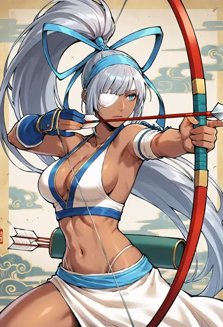 Alternative Appearance Outfit: eyepatch,grey hair,bandage over one eye,one eye covered,blunt bangs,hair ribbon,breasts,white sarong,sarong,gloves,tabi,partially fingerless gloves,underwear,panties,highleg panties,hairband,medium breasts,ribbon,large breasts,single glove,highleg,boots,blue gloves,midriff,white panties,yugake