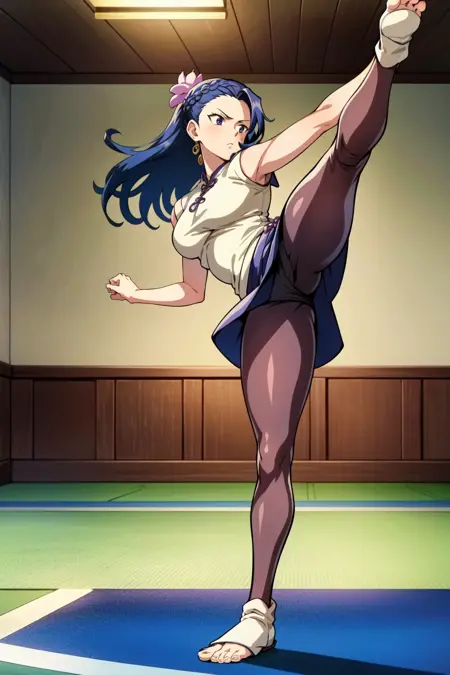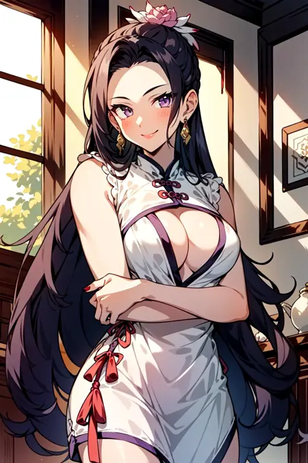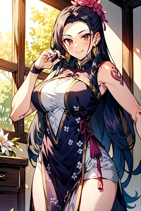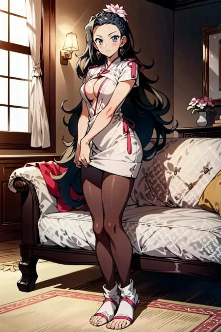Luong, 1girl, solo, long hair, jewelry, earrings, breasts, toeless legwear, pantyhose, hair ornament, full body, flower, hair flower, toes, cleavage, barefoot, dress, standing, feet, realistic, indoors, couch, mature woman