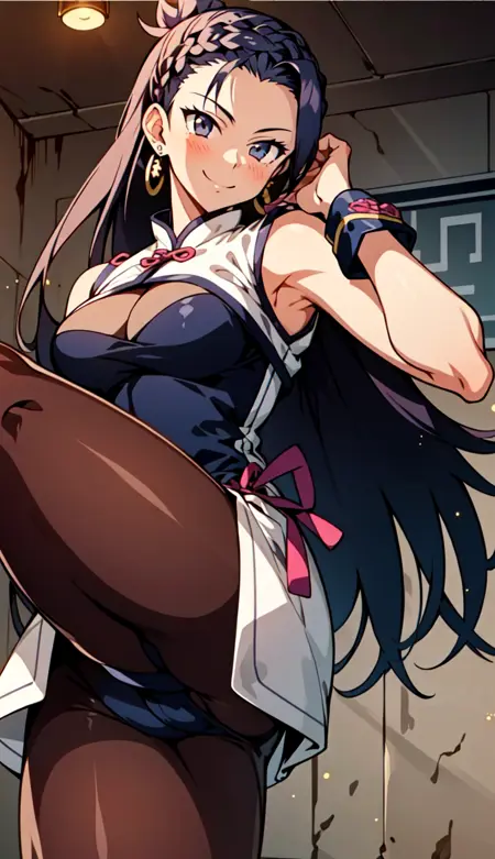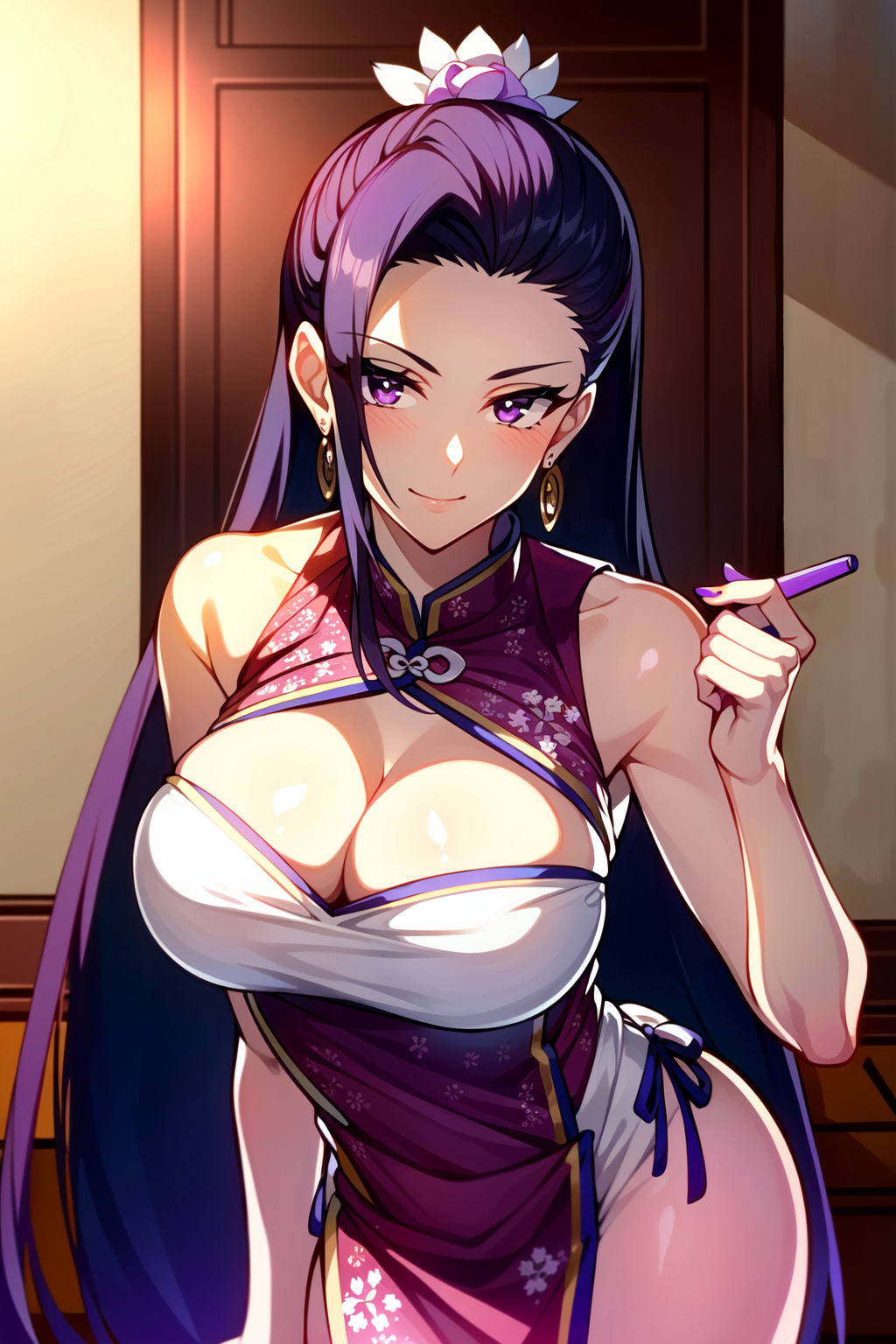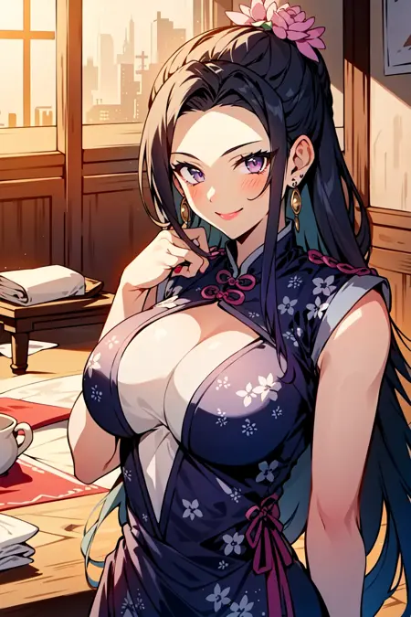 루옹, 1girl, solo, long hair, jewelry, earrings, breasts, toeless legwear, pantyhose, hair ornament, full body, flower, hair flower, toes, cleavage, barefoot, dress, standing, feet, realistic, indoors, couch, mature woman