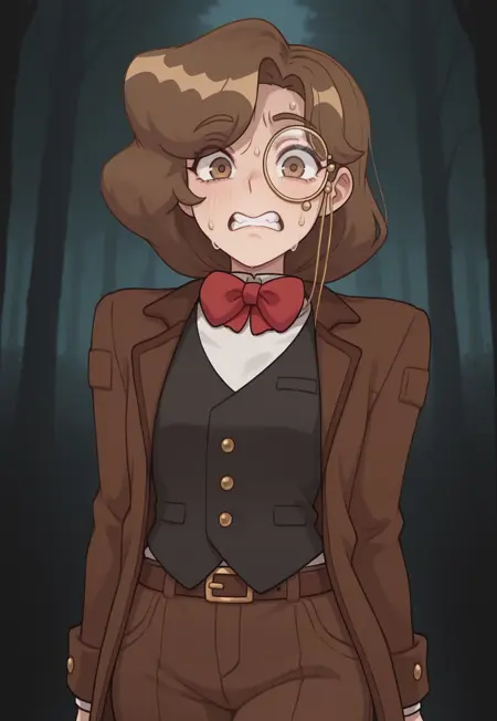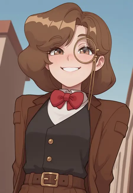 monocle, red bow tie, brown coat, white shirt, black vest, brown belt, tan trousers,