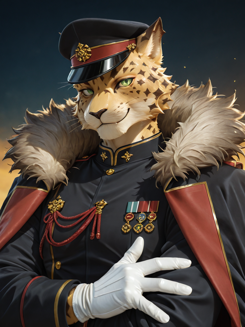 military uniform, black uniform, fur trim cape, military hat, white gloves,