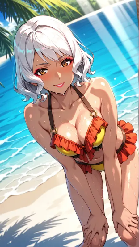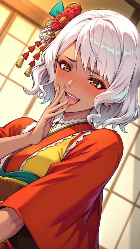 외모: 흰색 머리카락, 검은 피부를 가진 여성, 단발, 갈색 눈, 메이크업, 립스틱, 아이섀도우,