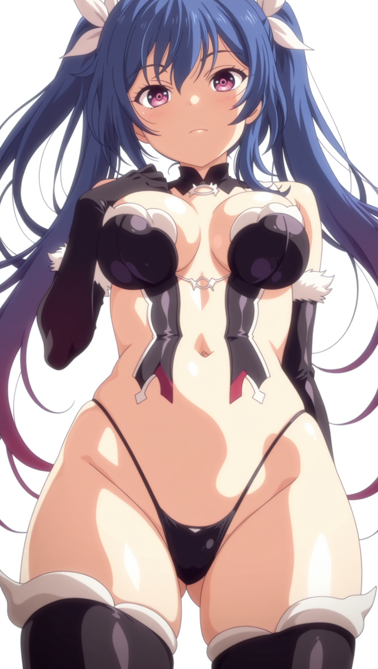 ((动漫上色)), 杰作,最佳画质,惊人画质,atsume,1个女孩,长发,双马尾,蓝发,紫眼,中等胸部,双面布料,肘部手套,高腰内裤,大腿袜,黑色高腰内裤,黑色大腿袜,单人,姿势,站立,看着观众,正面,((((白色背景,简单背景))))