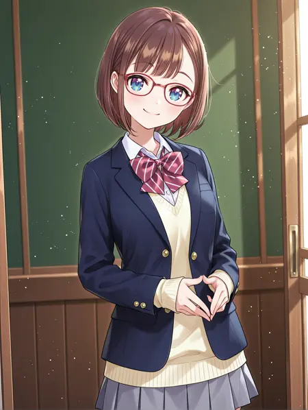 衣装ワード ・k_clothes,collared white shirt,striped bow,blue blazer,striped bowtie,long sleeves,sleeves past wrists,yellow sweater,gray pleated skirt,white kneehighs,black loafers,