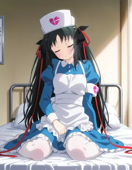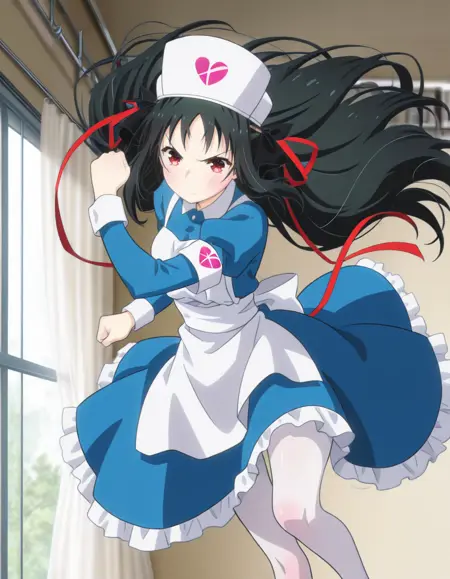 yayaNurse, nurse cap, blue dress, long sleeves, armband, white apron, white pantyhose,