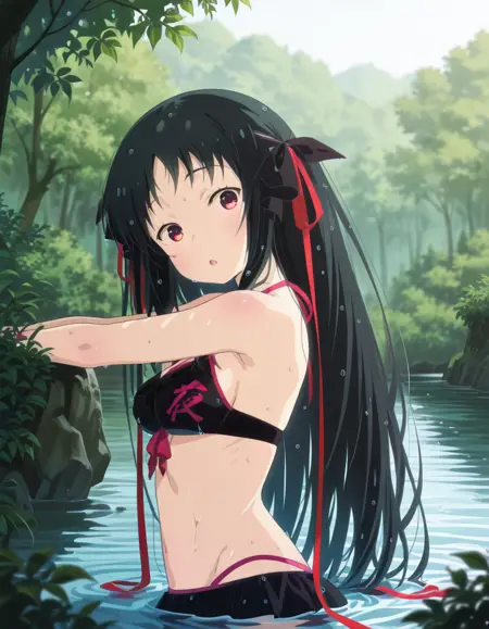 yaya, black hair, very long hair, bangs, red eyes, mature female,