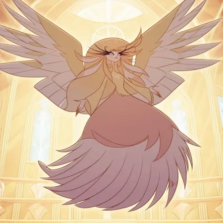 SoG(Character), female, angel, avian, wings, big eyelashes, no pupils, feather dress,