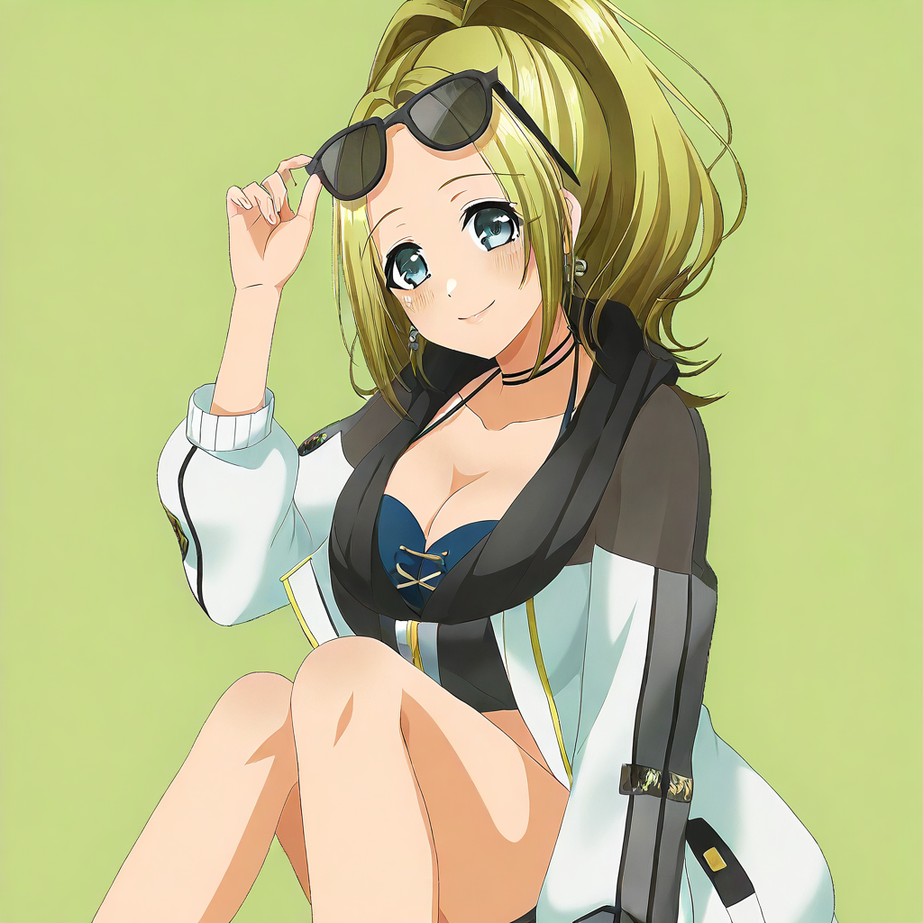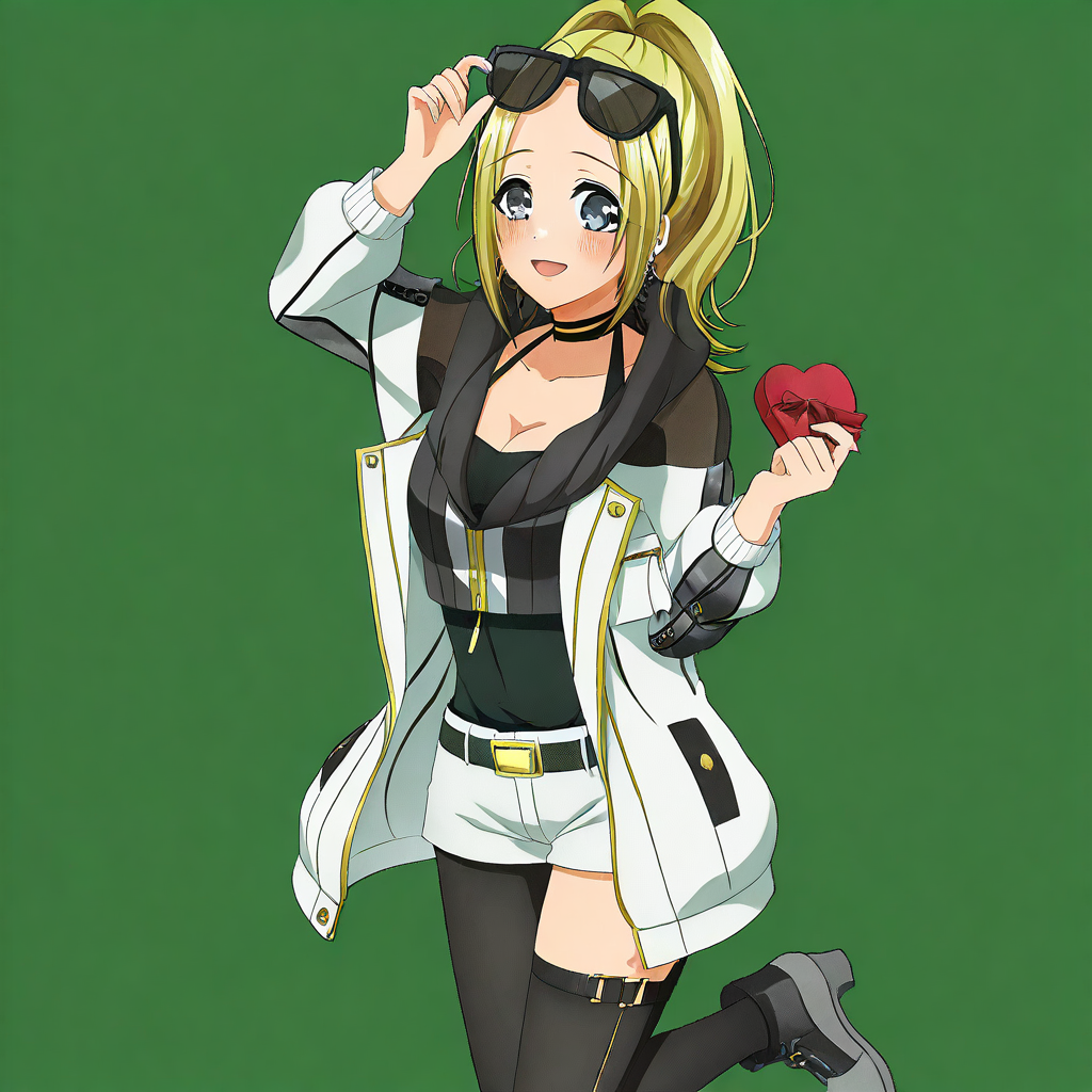 sasago jennifer yuka \(d4dj\), blonde hair, long hair, ponytail, sidelocks, blue eyes, earrings, jewelry, sunglasses on head, choker, jacket, vest, open clothes, undershirt, shorts, thighhighs, heels, cleavage, large breasts, 1girl, solo