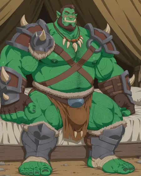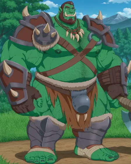 | 训练词汇 | <lora:Groth:0.6>,Groth,tusks,orc,male focus,1boy,bara,full body,muscular male,solo,monster boy,muscular,mature male,nipples,beard,green skin,pectorals,large pectorals,facial hair,colored skin,short hair,thick eyebrows,hairy,thighs,thick thighs,pointy ears,chest hair,nose ring,full beard,已复制! necklace,armor,jewelry,bulge,single pauldron,tooth necklace,pelvic curtain,weapon,shoulder armor,loincloth,pauldrons,已复制! |