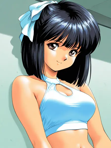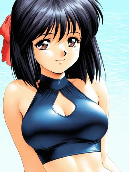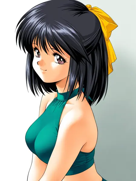 shimizu_masako, 1girl, solo, black hair, hair purple ribbon, large breasts,