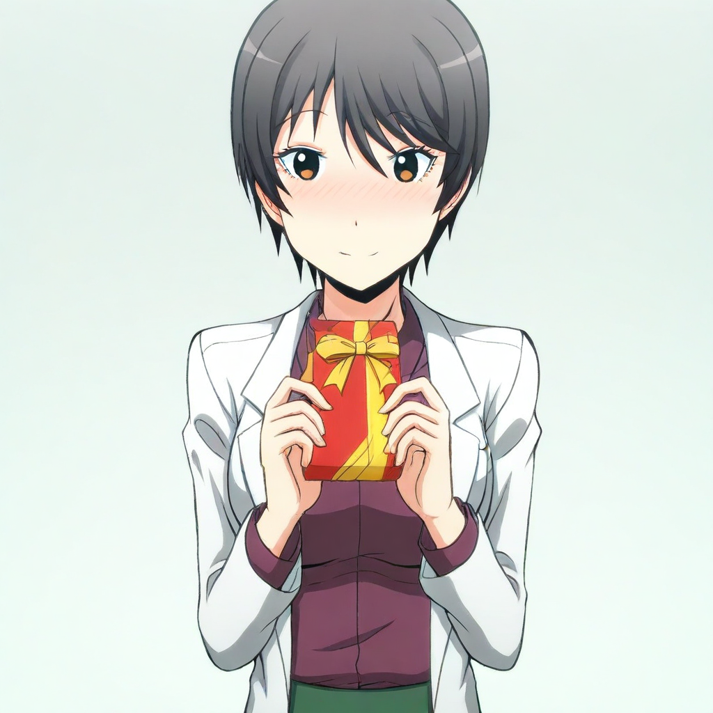 aguri yukimura \(assassination classroom\), black hair, short hair, brown eyes, lab coat, open clothes, dress, skirt, heels, large breasts, 1girl, solo