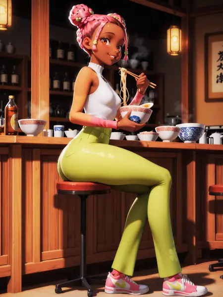 ダイアンのプロンプト:1girl, dark skin, dark-skinned female, pink hair, dreadlocks, brown eyes, double bun, hair bun, hair ornament, braid, multicolored hair, small breast, wide hips, thick thighs