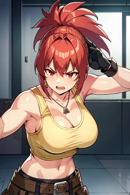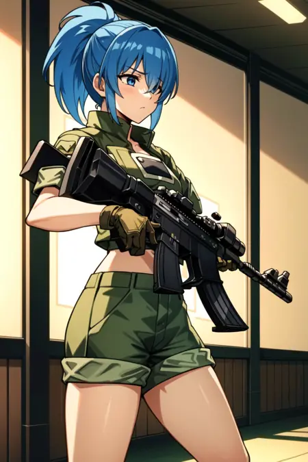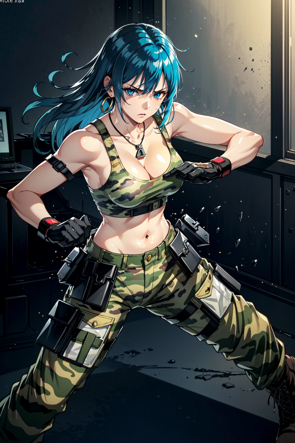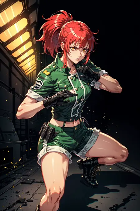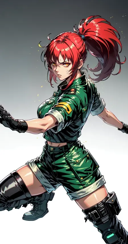 レオナ・ハイダーン, 1girl, leona heidern, solo, 青い髪, 青い目, ポニーテール, グローブ, ショーツ, ブーツ, ジャケット, 緑のショーツ, 緑のジャケット, クロップトップ, 簡単な背景, 長い髪, 包丁, バンズ, クロップドジャケット, 胸, 袖まくり