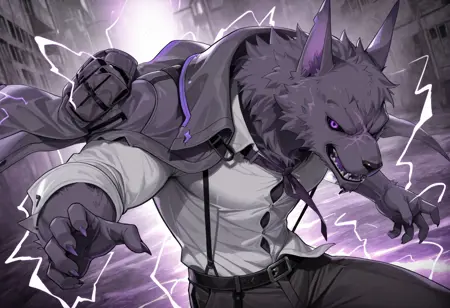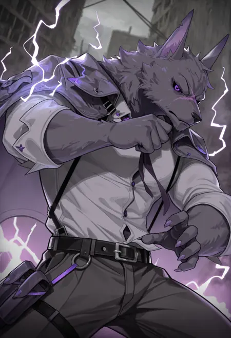 Illustrious: best quality, amazing quality, very aesthetic, absurdres, hires, Hug0_czn, 1boy, solo, furry, furry male, black sclera, purple eyes, face scar, muscular, wolf ears, white shirt, belt, ...your tags...