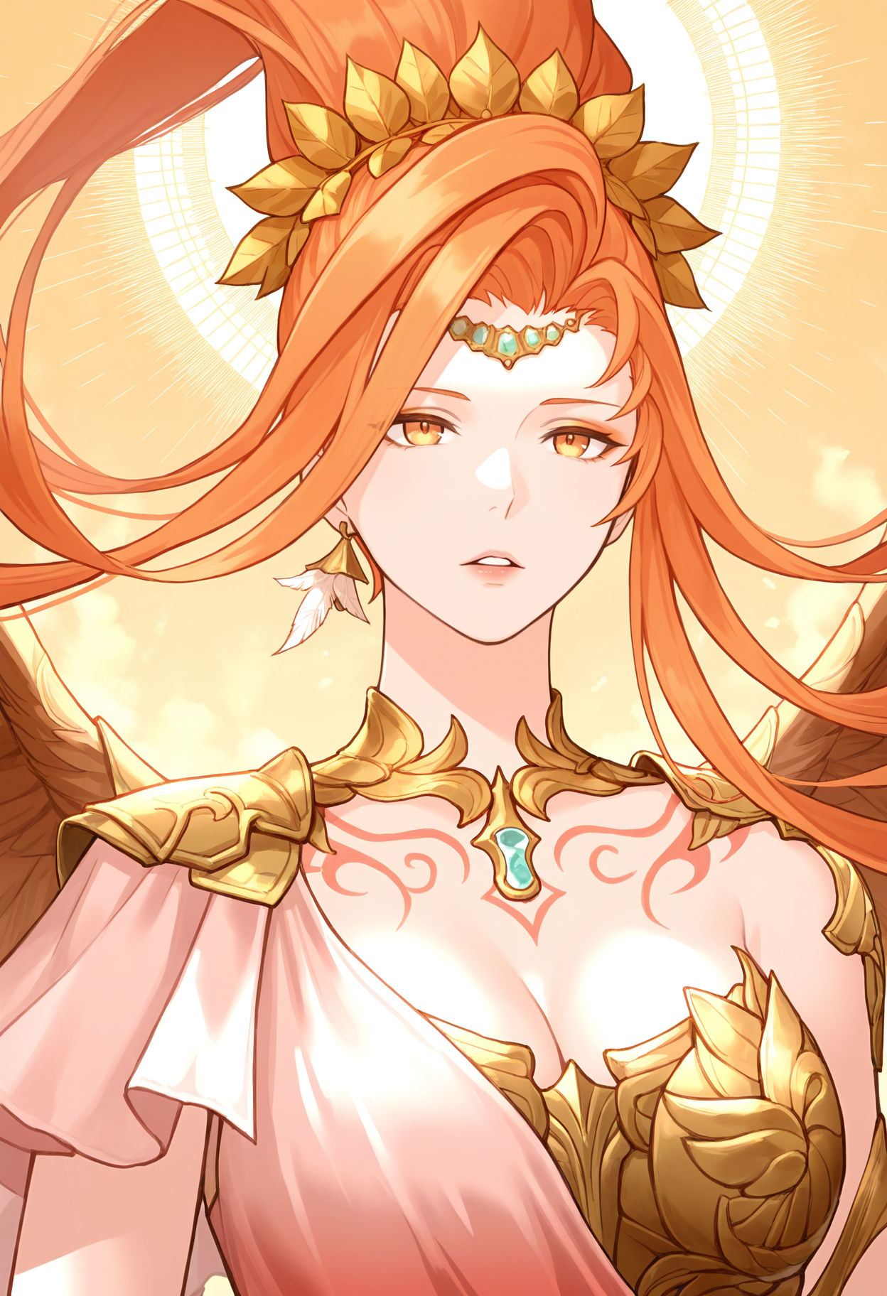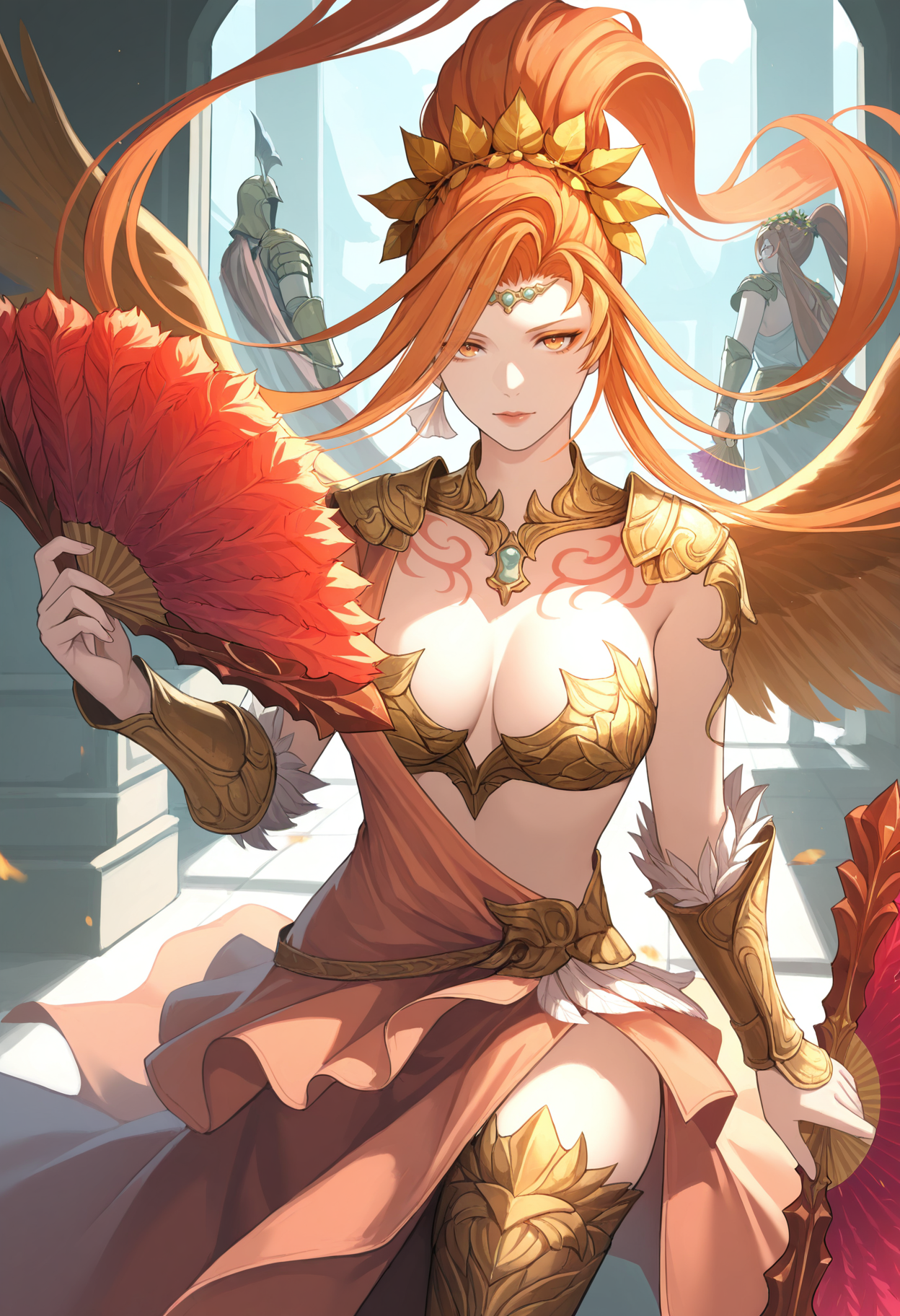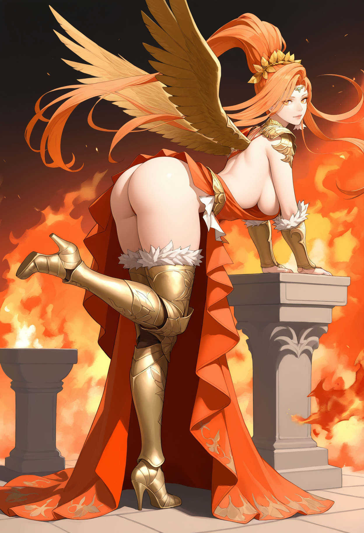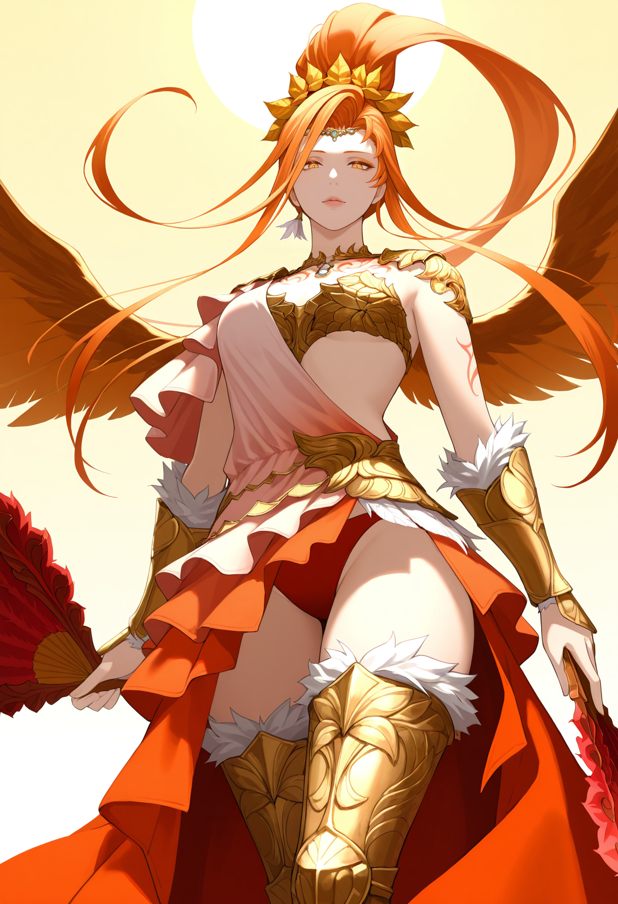 | Trained Words | Azeymaffxiv, orange eyes, orange eyeshadow, orange hair, long hair, floating hair, high ponytail, circlet, head wreath, laurel crown, single earring, gorget, aqua gemstone, shoulder armor, chest tattoo, red tattoo, feathered wings, orange wings, revealing clothes, bikin armor, gold armor, armored dress, asymmetrical dress, gradient dress, pink dress, red dress, single-shoulder dress, fur-trimmed armor, vambraces, fingerless gloves, faulds, red panties, leg tattoo, showgirl skirt, red skirt, armored legwear, gold thigh boots,Copied! |