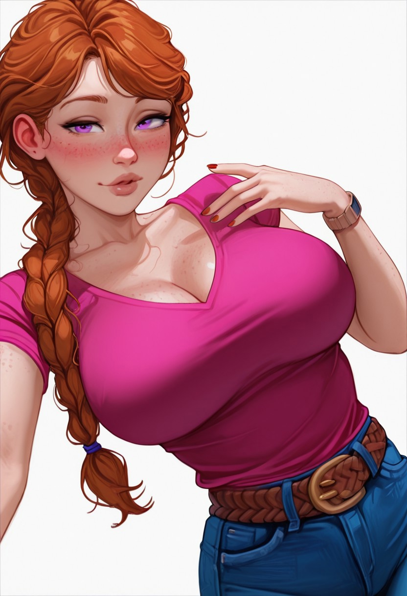 | Trained Words | Jodi_sdv, purple eyes, blush, freckles, lips, orange hair, long hair, single hair braid, large breasts,Copied! pink t-shirt, purple bra straps, blue jeans, belt buckle, brown belt,Copied! pink yoga pants, purple sports bra, blue headband,Copied! purple bra, floral print, purple panties, front bow,Copied! painted nails, nail polish, red nails,Copied! |