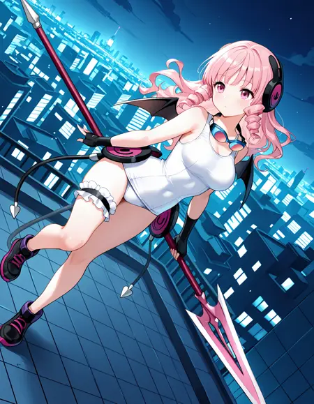rcswmswm, pink hair, long hair, wavy hair, drill hair, twin drills, bunny headphones, bat wings, pink eyes